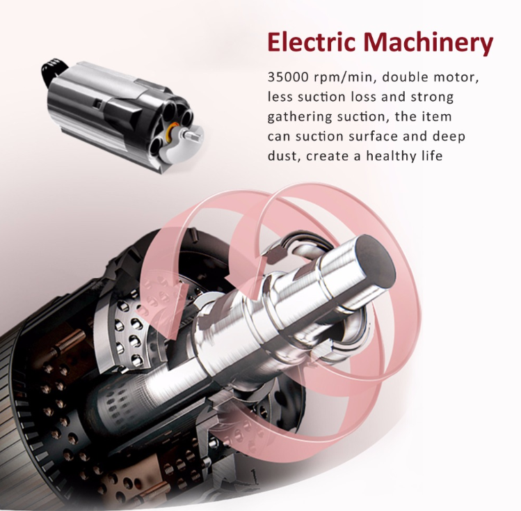 - 35000 rpm/min, double motor, less suction loss, and strong gathering suction, the item can suction surface and deep dust, create a healthy life