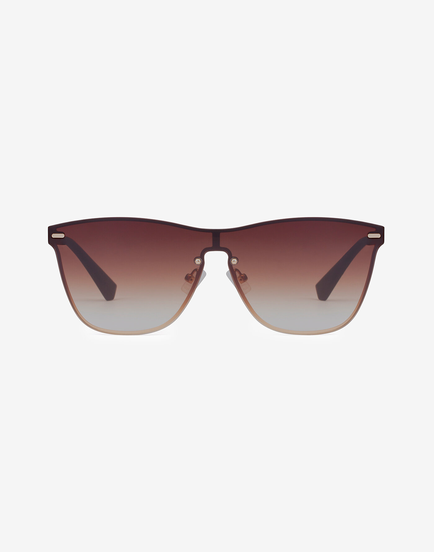 ONE-style full front sunglasses with matte gold metallic frame and brown gradient shield lenses.