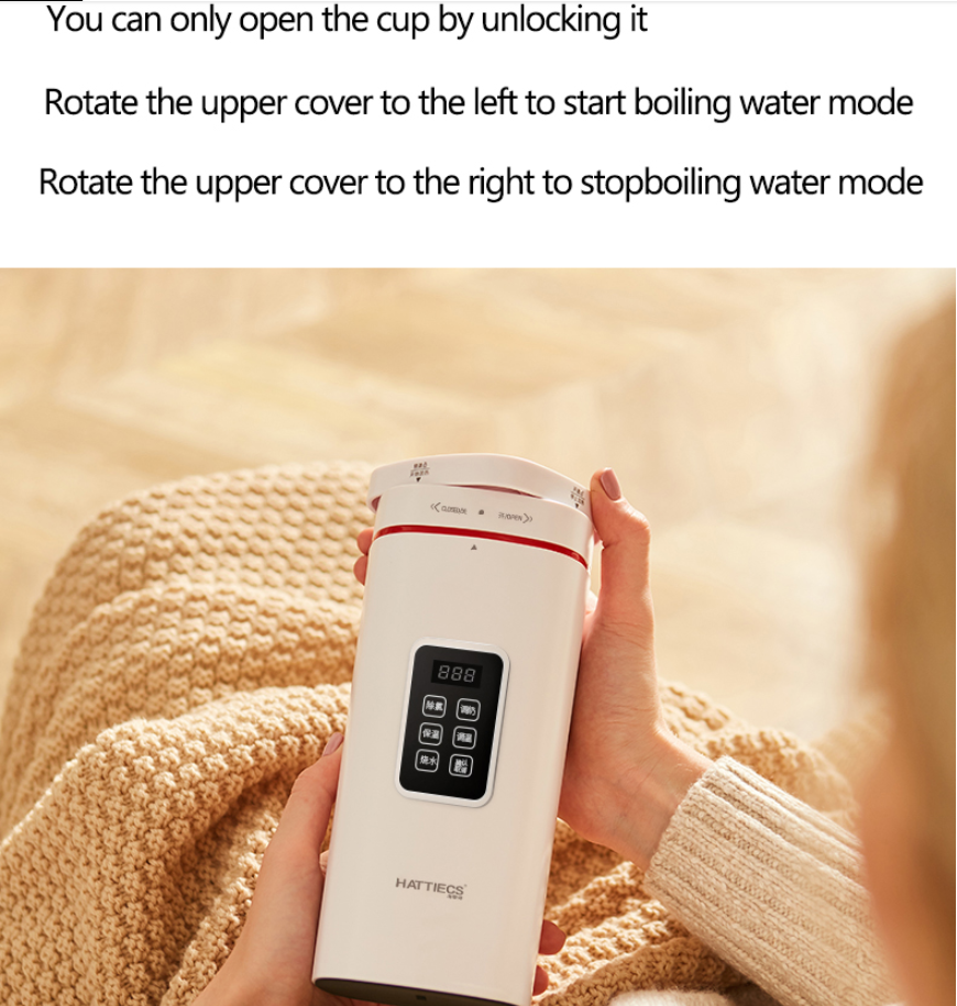 Rotate the lid to the left to activate the water boiling mode;rotate the lid to the right to stop the boiling mode ,unlock to open the lid. not only leakproof, but also safer.