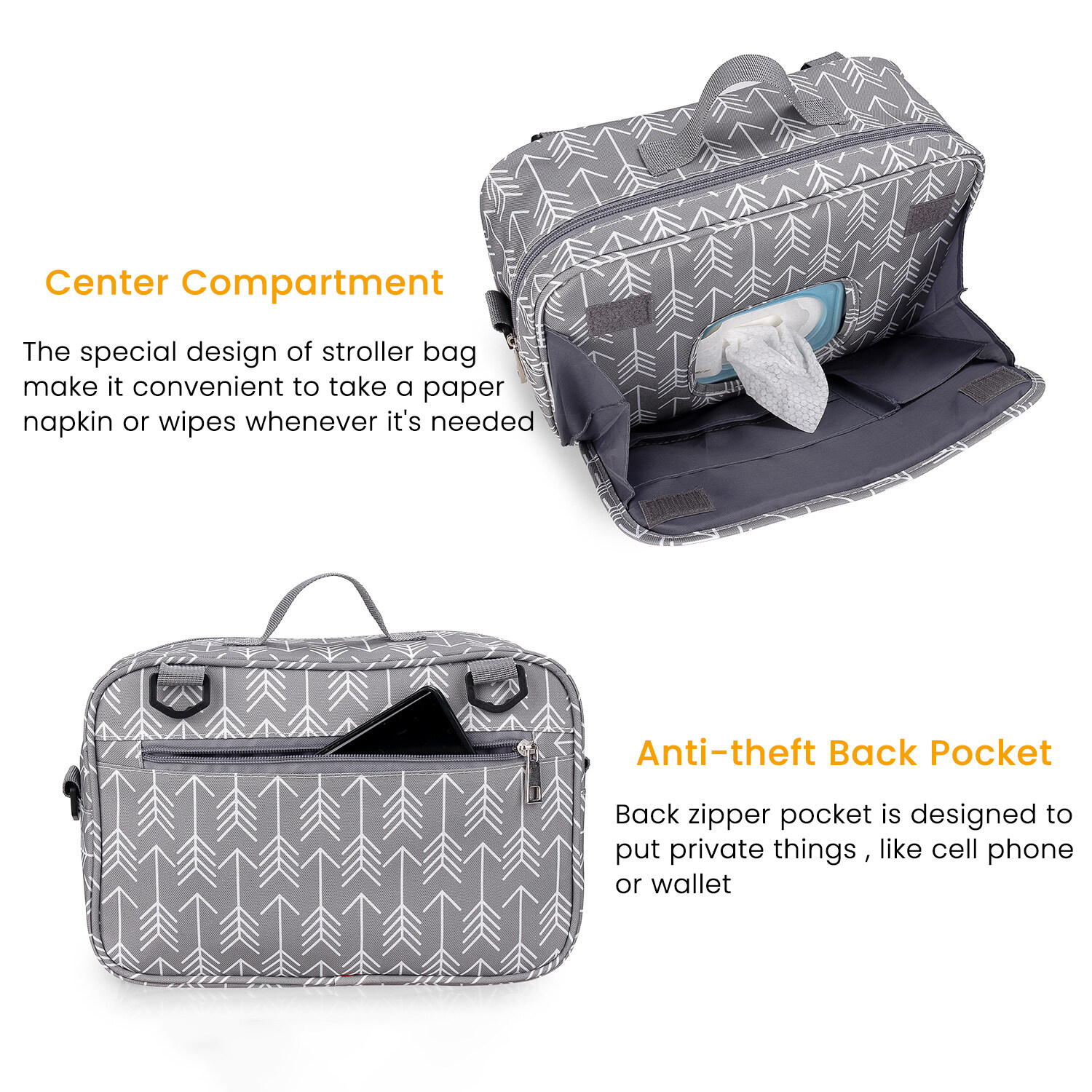 Take keys, phone, gifts, food, wallet, diapers, wipes, bottles, or books that are easily able to stow in a carry-on backpack, keep accessories out of sight with the covered storage pocket