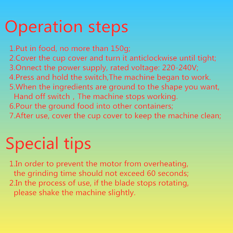 2.In the process of use, if the blade stops rotating,please shake the machine slightly.