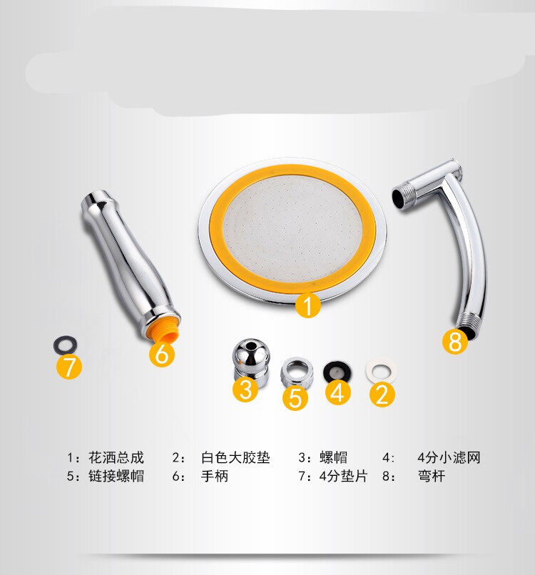 Item type:Shower NozzleOperating temperature:100 Celsius or lessFunction:Air bubble,rain,massage,sprayProcess:ElectroplatingNominal pressure:Specific weighing,Pressure boost and anti-block design,Ergonomic handleColor:yellow+silverMaterial:ABSProduct size:diameter 15cmPackage Contents:1* shower head