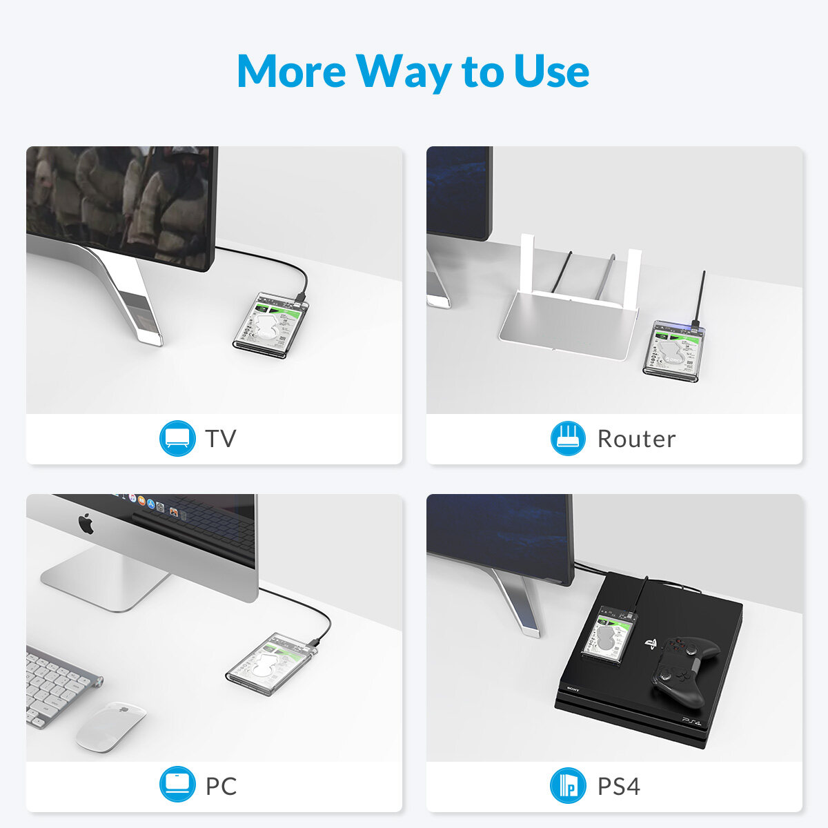 *Supports all standard 7mm/9.5mm 2.5 inch SATA I/II/III HDD and SSD up to 4TB(Max).