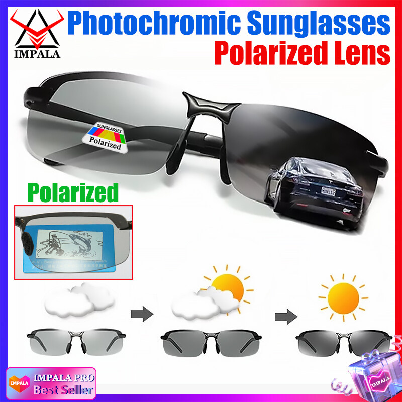 IMPALA PG036W Fashion Men Polarized Sunglasses Metal Frame Photochromic Lens Anti Glare UV Protective Eyeglasses Original Style Korean Sun Glasses UV400 HD Lens Change Color Itself