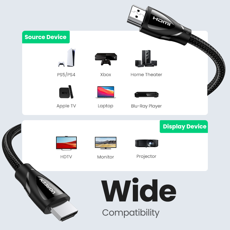 The hdmi 8k cable supports higher resolution of 8K 60Hz FUHD, and compatible with 8K 50Hz, 4K 120Hz UHD, 4K 100Hz and more, providing Ultra HD cinematic experience and 3D visual effects.