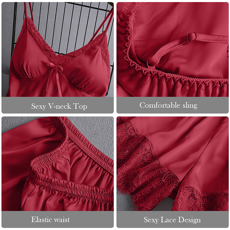 Features:Women Pajamas Set Solid Color Sleepwear Lace Camisole High Waist Short Two-piece Set Silk Home WearNotice:For manual measurement, please allow 1-3cm error Size:S-3XLColor:black,blue,pink,gray,green,redMaterial:satin + eyelash lacePackage Includes:a pcs Pajamas SetCare instructions: Hand washing is recommendedSize: please allow 1-2cm differs due to manual measurement, thanks.Note: Due to the difference between different monitors, the picture may not reflect the actual color of the item. We guarantee the style is the same as shown in the pictures, but not the same performance on different bodies as on the model. Thank you!