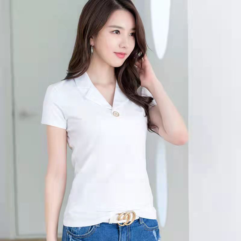 100KG Can Wear Suit Collar Short Sleeve T-shirt Women Polo Shirt Korean Style Temperament Elegant V Neck Retro Plain Shirt Female Lapel t shirt Plus Size Work clothes high-quality