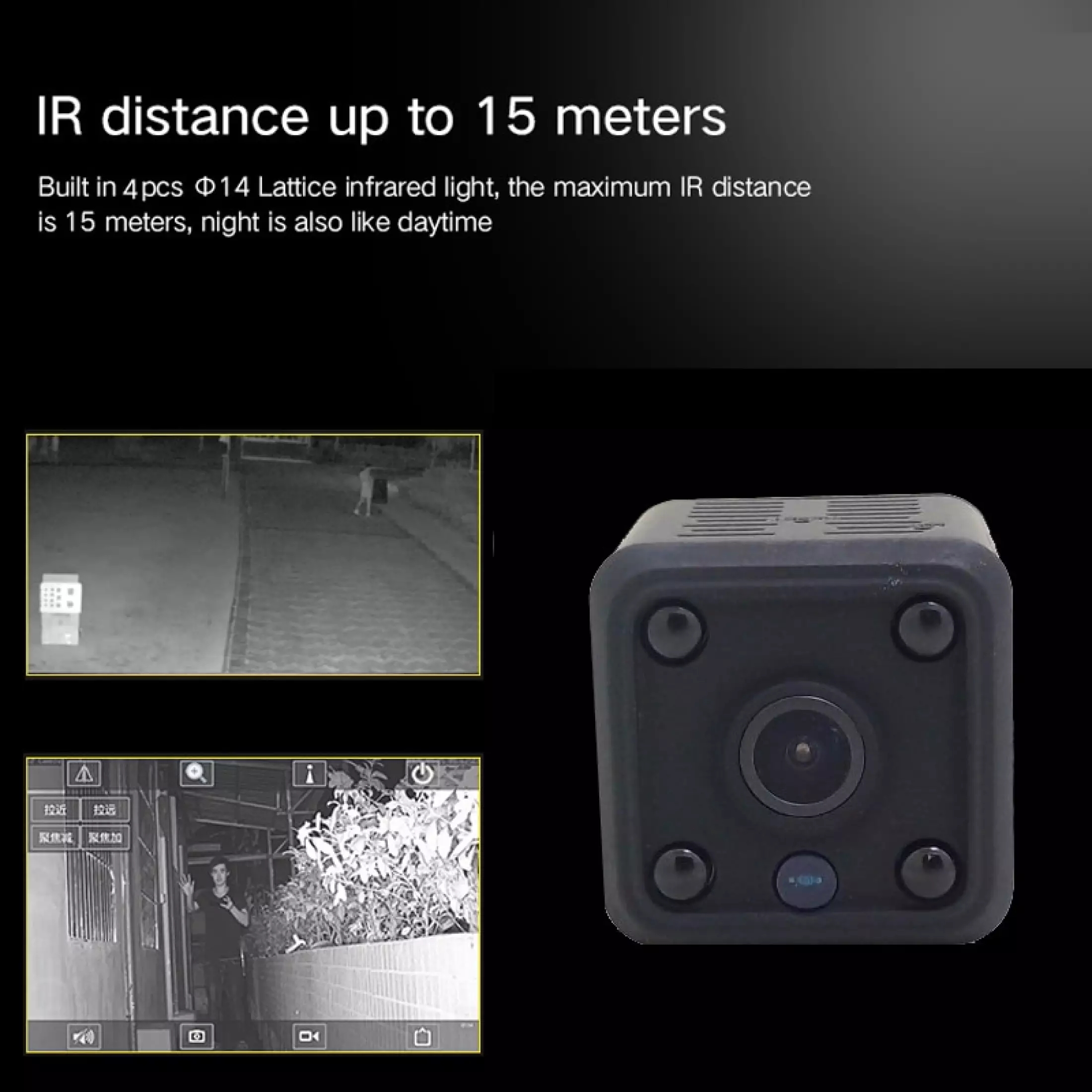 2. Wireless WiFi 1080P camera, equipped with dim infrared night vision lamp, the longest distance is 0-8m, 1080P high-definition video, equipped with wide-angle lens.
