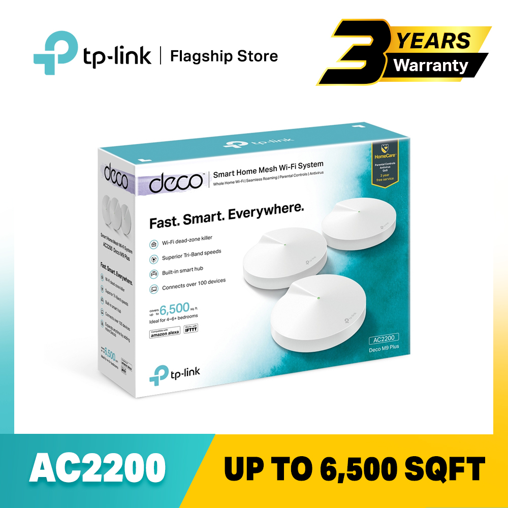 TP-LINK Deco M9 Plus(3-pack) AC2200 Tri Band Gigabit MU-MIMO WiFi Mesh Router (Whole Smart Home Mesh WiFi System) Works with all Telcos (Supports IPTV)