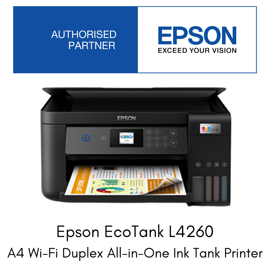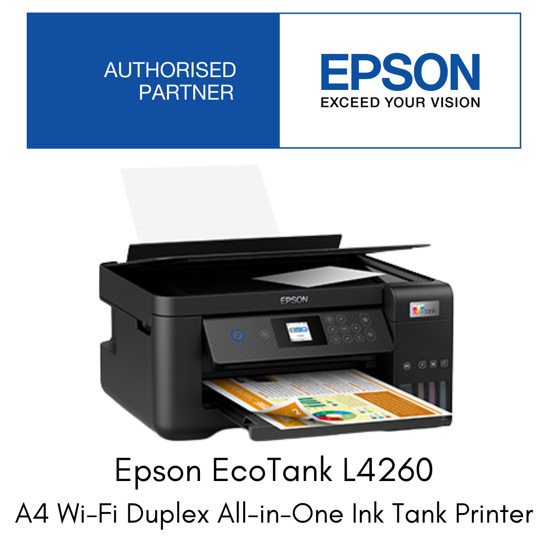 The sleek black EcoTank L4260 is in a class of their own. These printers come with an integrated ink tank system, and compact enough to fit perfectly in any office. Enjoy spill-free refilling with individual ink bottles that have designated nozzles. Get sharp and smudge-free black-and-white documents that are printed using black pigment ink. Equipped with auto-duplex printing, you can print on both sides of paper easily, significantly reducing paper cost and wastage. Choose to print wirelessly over network or directly from connected mobile devices via Wi-Fi Direct. You can also download the Epson Smart Panel app to your mobile device, turning it into an intuitive control centre that enables you to set up, monitor and operate your printer effortlessly. Enhance your business performance with this smart print solution today.
